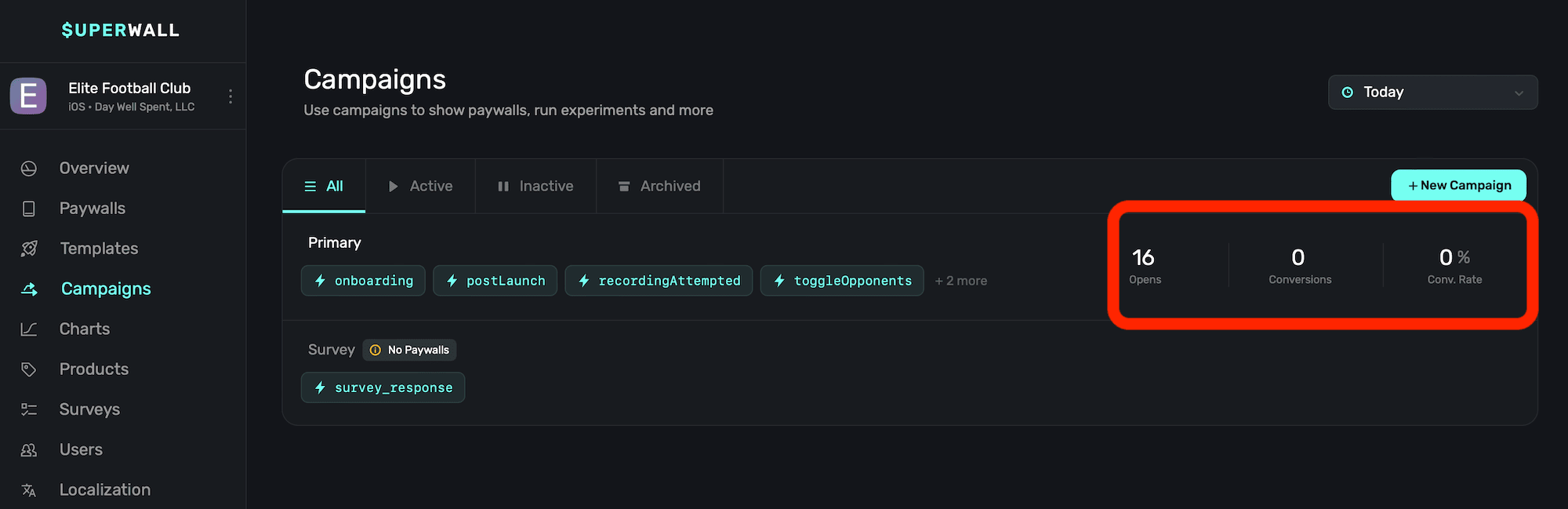 If the campaign isn't currently serving any paywalls because none have been attached to it, you'll see a wanting indicating that in this view. In the image above, that's the case for the campaign at the bottom, called "Survey".