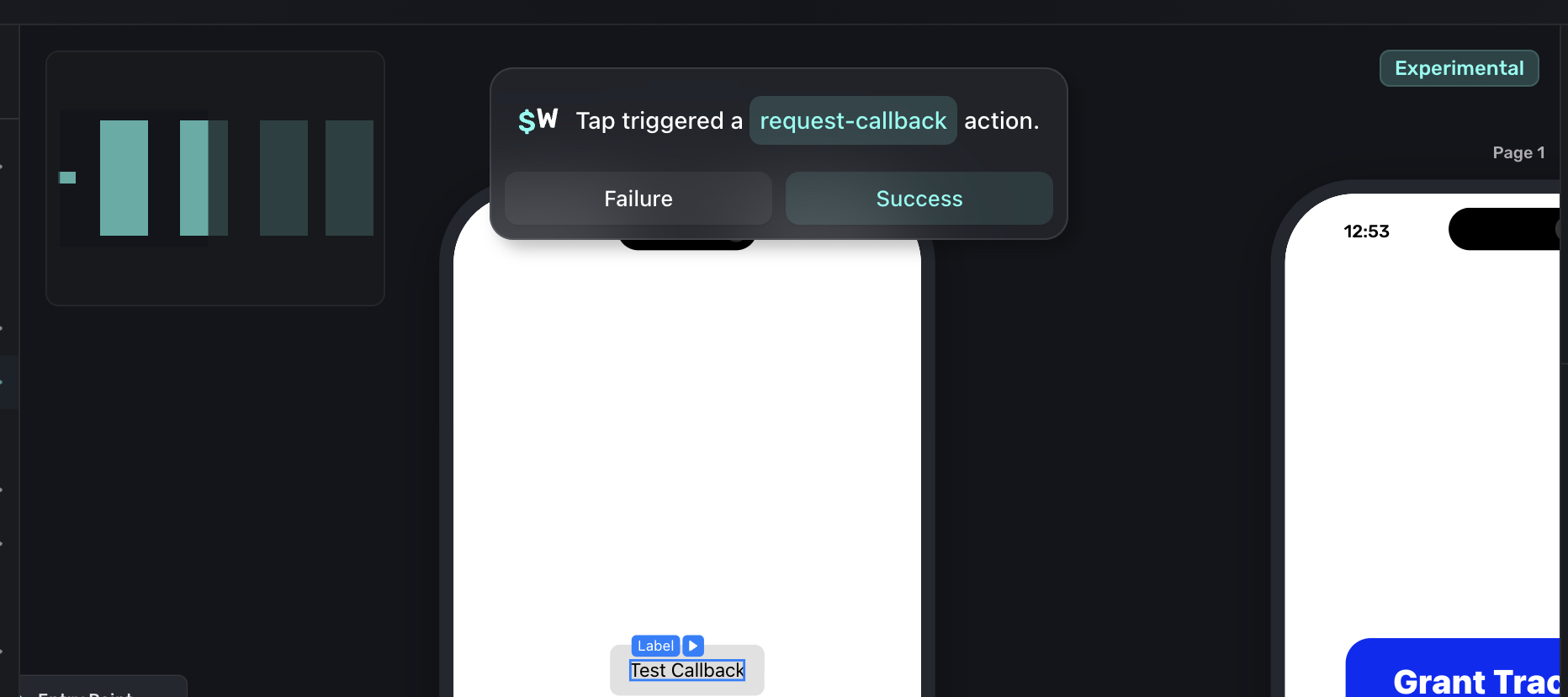 Custom Callback actions can also be tested in the editor. When a callback fires, the editor shows a simulation toast with Success and Failure buttons. If the callback is configured as Blocking, the action chain pauses until you click one. If it's Non-blocking, the chain continues immediately and you can click whenever you're ready. This lets you test both paths of your callback logic without writing any SDK code.