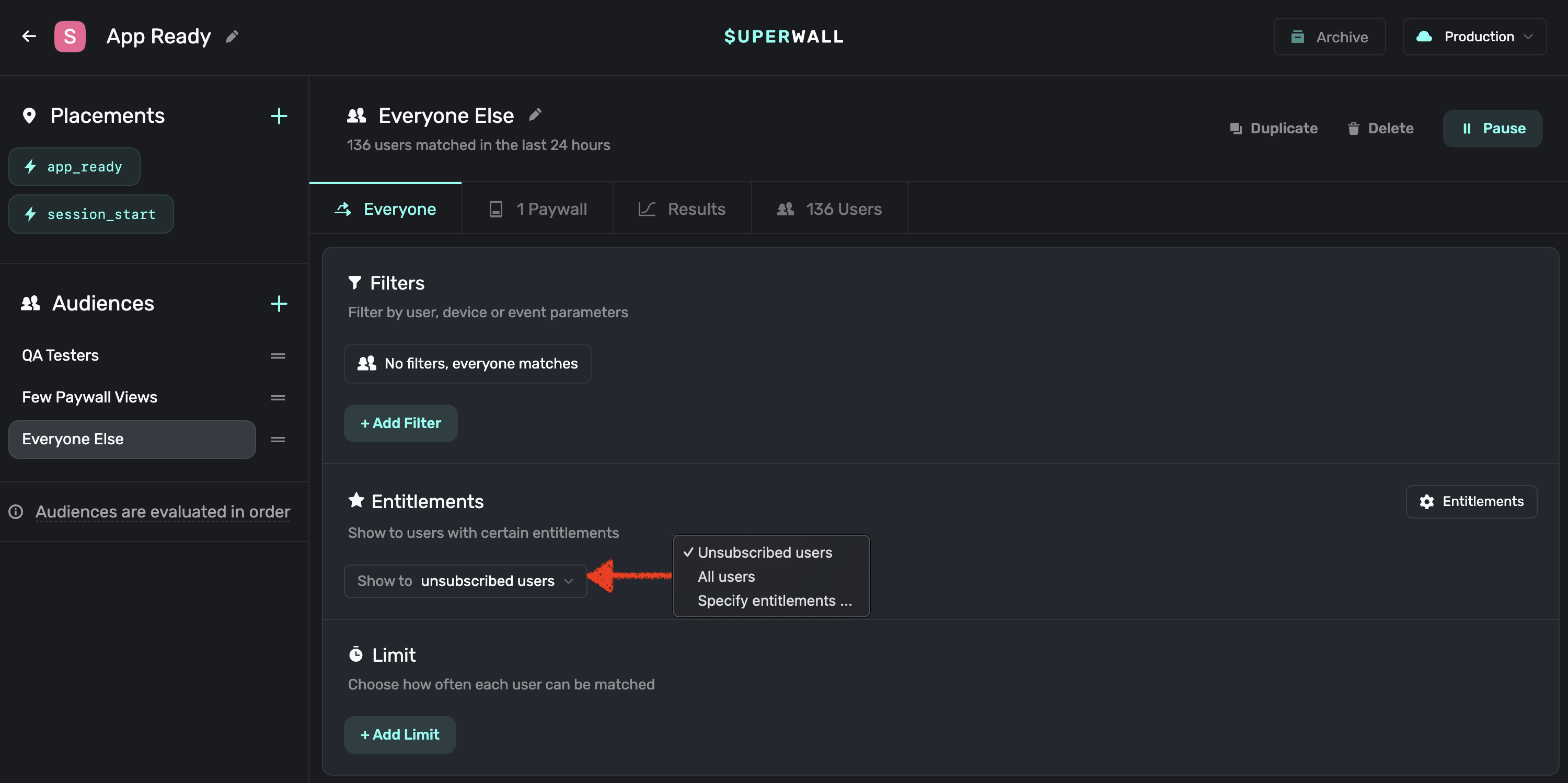 In the Paywall Editor you can choose whether to always present a paywall or ask the SDK to check the user subscription before presenting a paywall. For users on v4 of the SDK, this is replaced with a check on the entitlements within the audience filter. As you migrate your users from v3 to v4 of the SDK, you'll need to make sure you set both the entitlements check and the paywall presentation condition in the paywall editor.